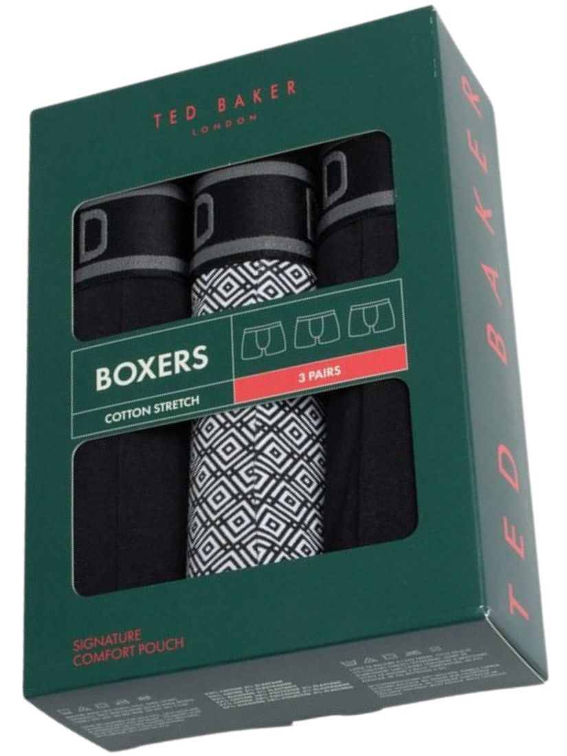 - Ted Baker 3-Pack Boxer Briefs in black, with 1 pair featuring a stunning geometric pattern print