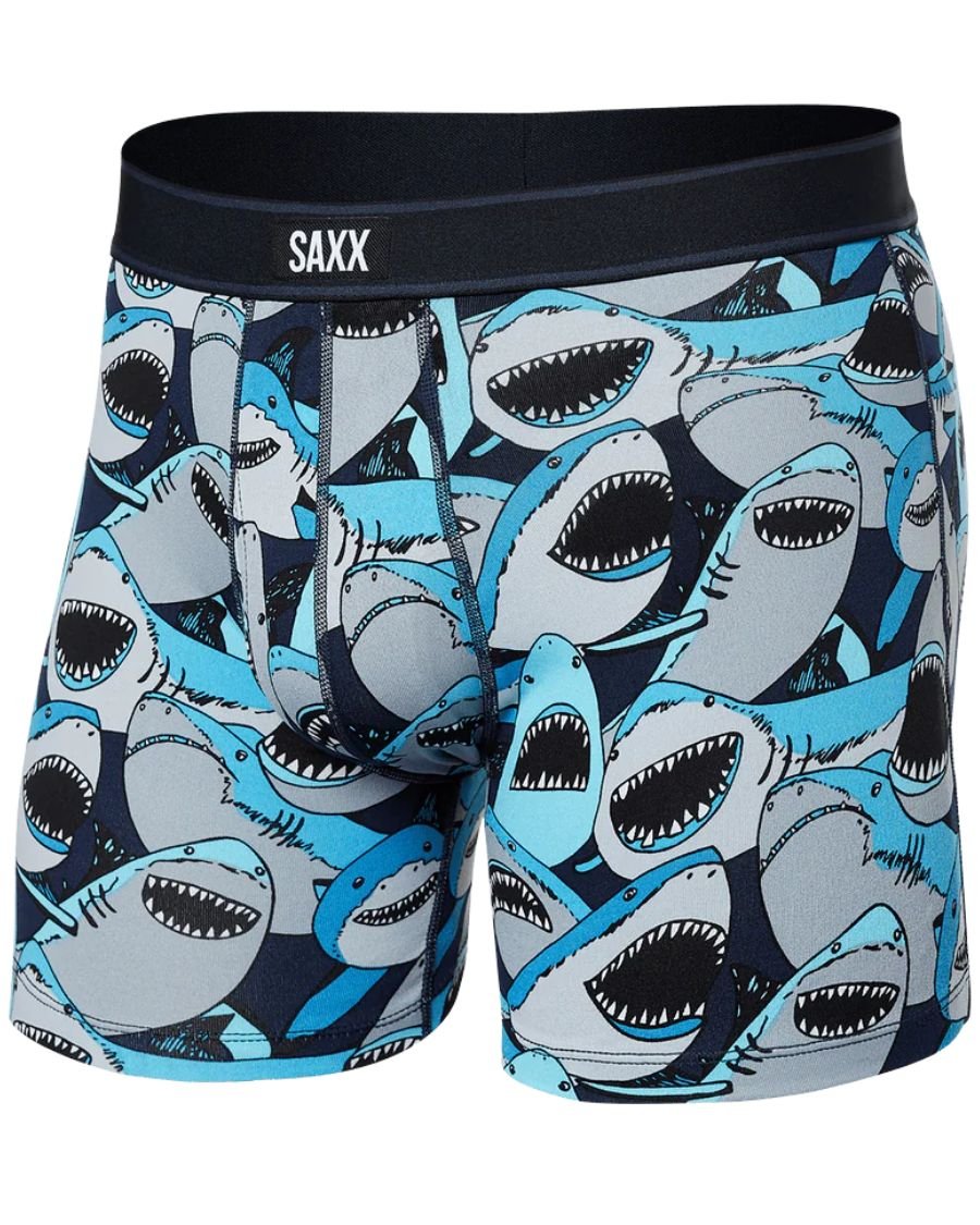In the SAXX Daytripper range we have the shark tank camo print in a 5 inch Boxer Brief, which is available in multiple sizes: Small = 30-32 inch waist, Medium = 33-35, Large = 36-38, X-Large = 39-42, XX-Large = 43-46