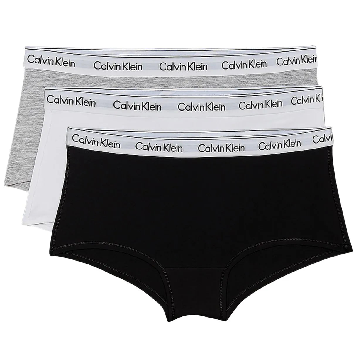 • Great-value 3-pack of Calvin Klein women's Modern Logo boy shorts in black, white, and heather grey
