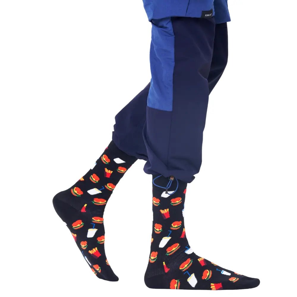 Serve up bold personality with these Happy Socks Hamburger Socks. Set against a sleek black base, the playful all-over print features colourful burgers, fries and drinks – a fun twist on everyday essentials with unmistakable attitude.