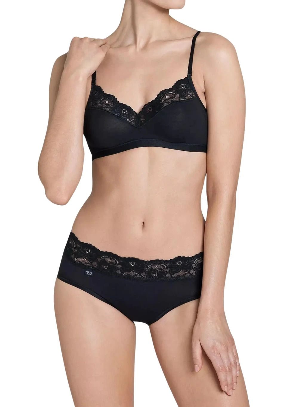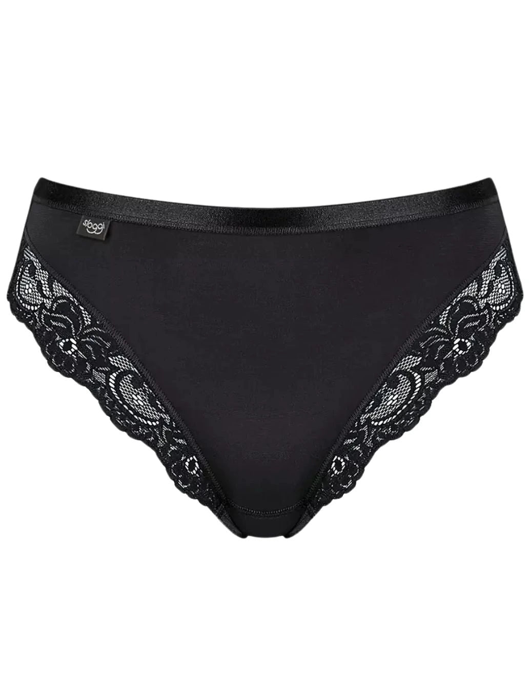 Beautiful Sloggi Romance Tai brief in black, made from the finest Supima® cotton for total comfort and shimmery microfibre. Delicate lace detailing adds a feminine touch. Perfect to team up with the matching Sloggi bra.
